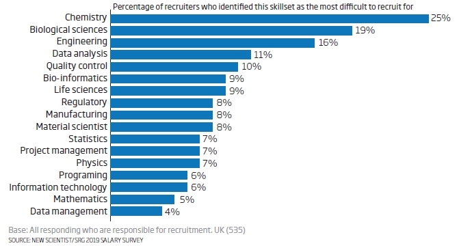 New Scientist bu sorulara anlamlı cevaplar bulmaya çalıştı. New Scientist işe alım firması SRG ile birlikte, İngiltere'de bilim ve mühendislik alanında çalışan 2750 kişiyi araştırdı. Bunlardan 535'i, bilim ve teknik personeli işe almadan sorumlu olan gruptu. Bu işe alım uzmanlarının dörtte biri kimya becerisinin bulunması en zor beceri olduğunu bildirdi. Araştırmaya göre kimya, bulunması en zor olan yetenekleri listesinin başında yer aldı.