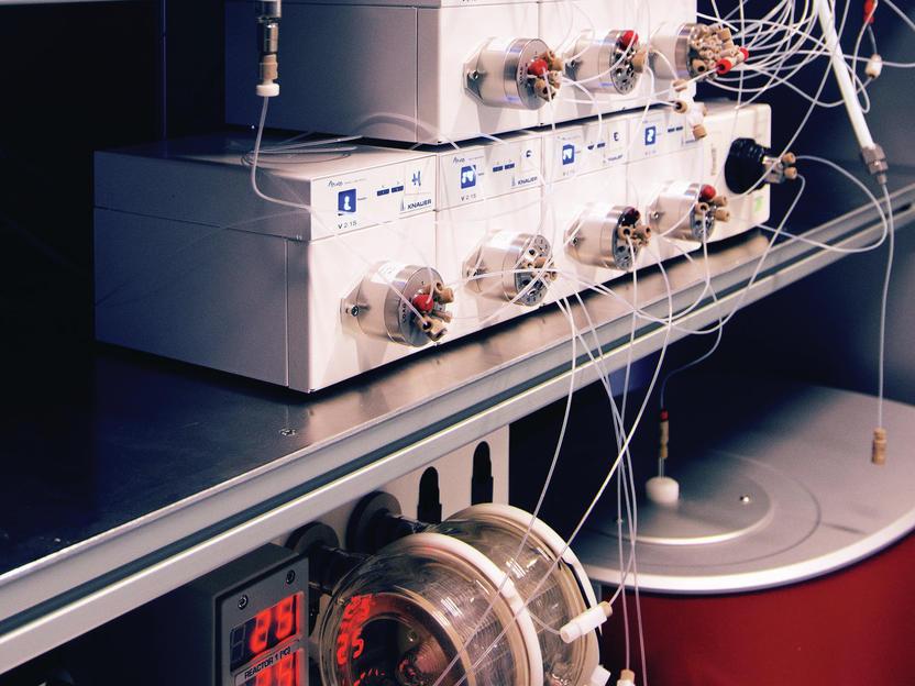 Çok amaçlı bir reaktör: Max Planck Kolloidler ve Arayüzler Enstitüsü'nde Kerry Gilmore ve Peter Seeberger liderliğindeki bir ekip radyal sentez için otomatik bir makine geliştirdi. Reaktörün kalbi resmin altındaki silindirik kaptır - reaksiyonların gerçekleştiği yer burasıdır.